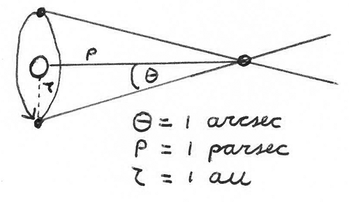 One parsec is the distance from the Sun to a nearby astronomical object that has a parallax angle of 1 second of arc.